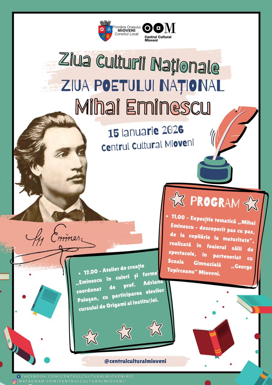 Centrul Cultural și Primăria Orașului MIOVENI vă invită joi, 15 ianuarie 2026, să celebrăm împreună cultura română și personalitatea marcantă a poetului național Mihai Eminescu, printr-o serie de activități dedicate publicului de toate vârstele.